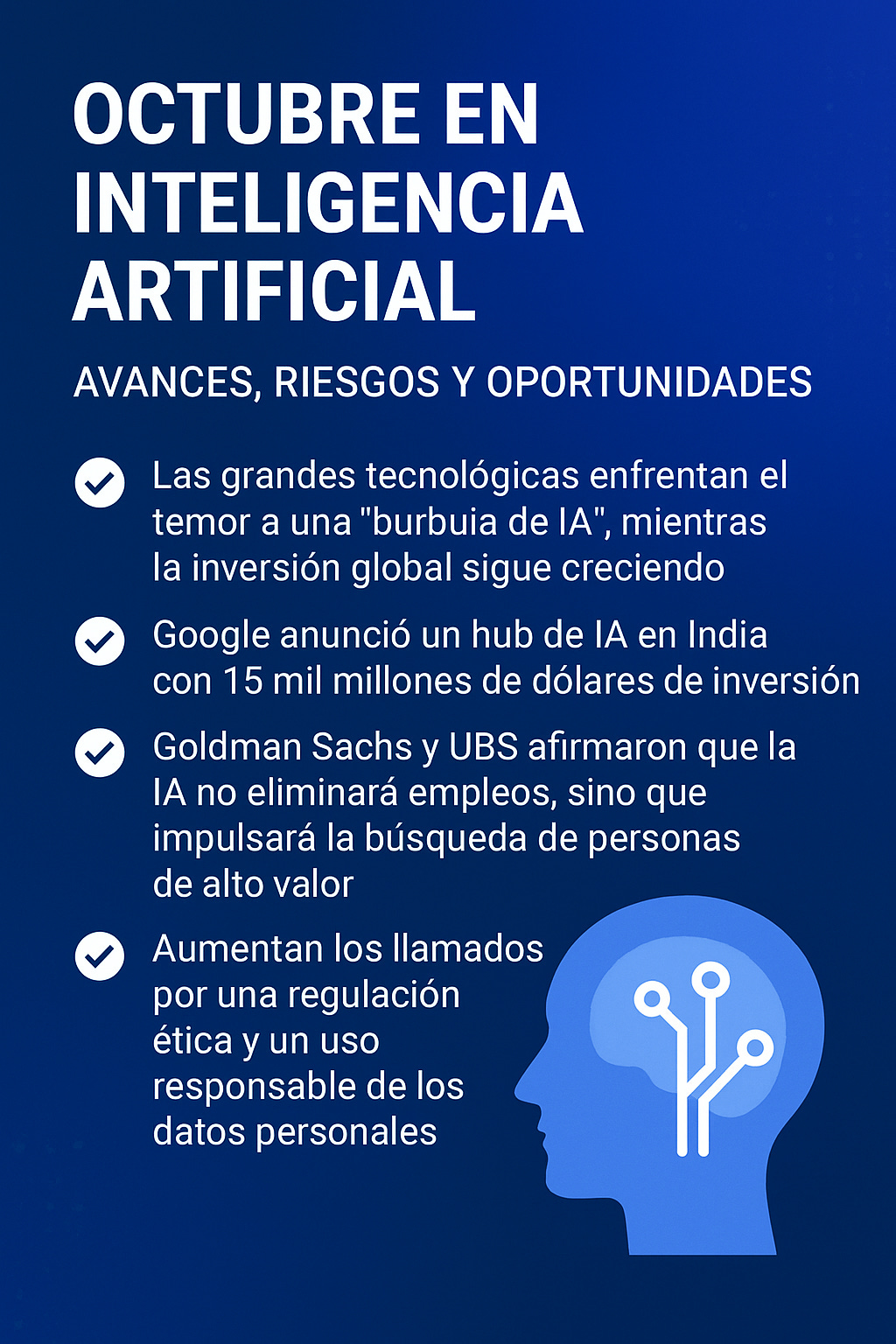 El mes de octubre trajo una avalancha de noticias sobre inteligencia artificial (IA). Desde grandes inversiones globales hasta llamados por una regulación más ética, la IA sigue marcando el ritmo de los cambios tecnológicos y laborales.